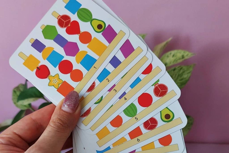 22عدد مهره چوبی رنگی با اشکال هندسی و طرحهای میوه 10عدد کارتهای الگویی دورو برای تمرین و بازی فکری