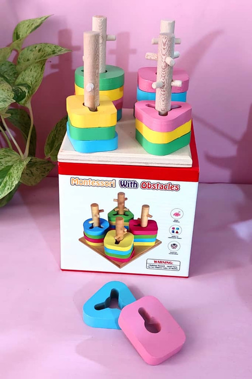 در مونته سوری چوبی پین دار، بچهها باید قطعات رنگی چوبی را (با شکلای مختلف) رو از مسیر پینهای چوبی رد کنن و سرجاشون بذارن.